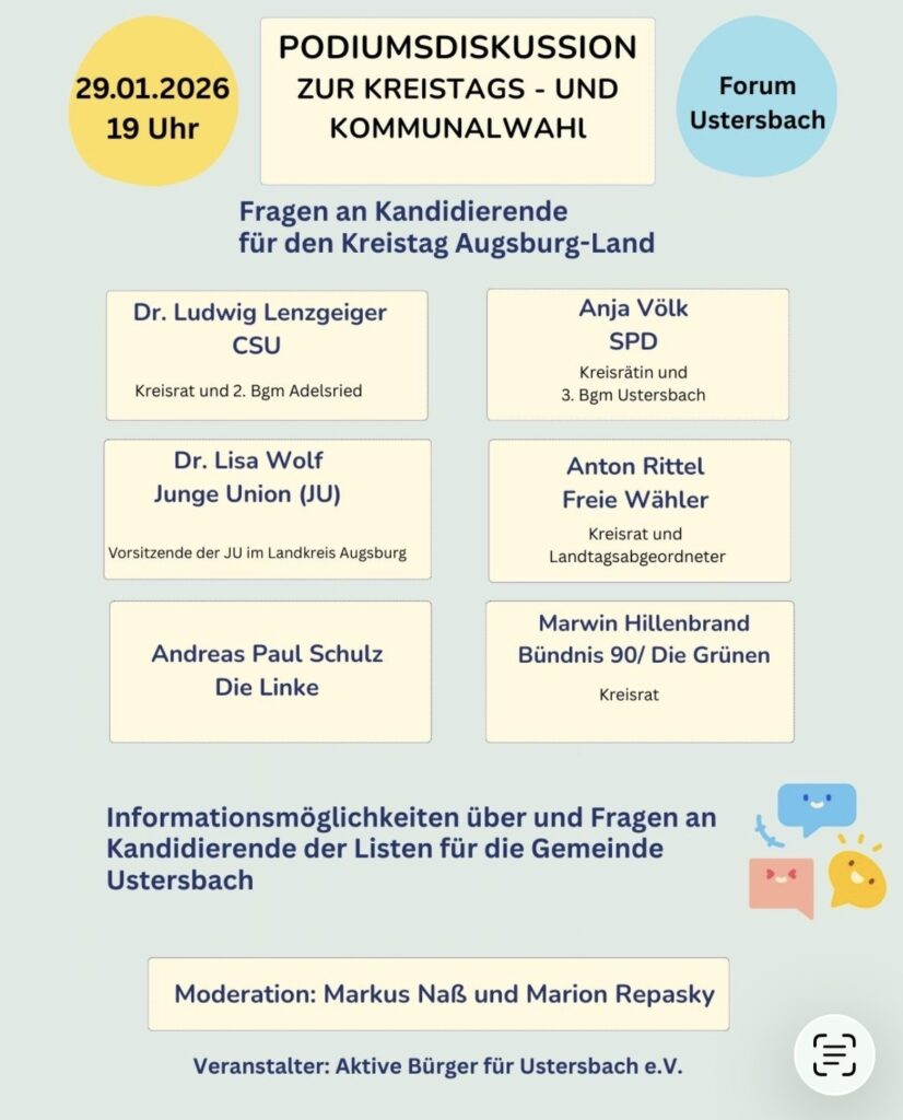 Wir sind eine unabhängige und überparteiliche Wählergemeinschaft, die sich für die Zukunft und das Wohl unserer Gemeinde einsetzt. Bei der ABU stehen Bedürfnisse und Ideen der Ustersbacher Bürgerinnen und Bürger im Mittelpunkt. Informationen zu Themenbereichen, zur Kommunalwahl 2026, zu Veranstaltungen und Beteiligungsformaten werden hier zu finden sein.